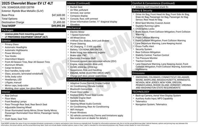 Check out this 2025 Chevrolet Blazer EV LT in Riptide Blue Metallic with Black Cloth interior! AWD 1-Speed Automatic Electric Motor 85 kWh Battery Capacity, EPA estimated 283 mile range, Automatic temperature control, Dual front impact airbags, Dual front side impact airbags, Four wheel independent suspension, Preferred Equipment Group 4LT, Wheels: 19 Machined-Face Aluminum. 102/87 City/Highway MPG