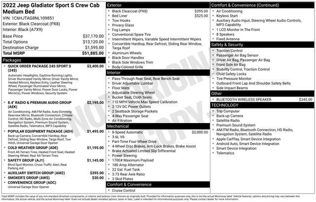 Check out this 2022 Jeep Gladiator Sport in Black Clearcoat with Black Cloth interior! 17/22 City/Highway MPG 4WD 8-Speed Automatic 3.6L V6 24V VVT 1-Year SiriusXM Guardian Trial, 110 MPH Vehicle Max Speed Calibration, 115V Auxiliary Power Outlet, 220 Amp Alternator, 240 Amp Alternator, 400W Inverter, 5-Year SiriusXM Traffic Service, 5-Year SiriusXM Travel Link Service, 700 Amp Maintenance Free Battery, 8.4 Radio & Premium Audio Group, 8.4 Touchscreen Display, Air Conditioning w/Auto Temperature Control, Alpine Premium Audio System, Apple CarPlay, Auto-Dimming Rear-View Mirror, Automatic Headlamps, Auxiliary Switch Group, Auxiliary Switches, Black 3-Piece Hard Top, Blind Spot & Cross Path Detection, Body Color Fender Flares (2-Piece), Class IV Receiver Hitch, Cold Weather Group, Console Bin Task Light, Convenience Group, Daytime Running Lamp System, Deep Tint Sunscreen Windows, Emergency/Assistance Call, For Details, Visit DriveUconnect.com, For More Info, Call 800-643-2112, Freedom Panel Storage Bag, Front 1-Touch Down Power Windows, Google Android Auto, GPS Antenna Input, HD Radio, Heated Front Seats, Heated Steering Wheel, Heavy-Duty Engine Cooling, Integrated Center Stack Radio, Integrated Voice Command w/Bluetooth®, Leather Wrapped Steering Wheel, LED Taillamps, Media Hub w/2 Charge Only USBs, Navigation System, Normal Duty Plus Suspension, Off-Road Info Pages, ParkSense Rear Park Assist System, Popular Equipment Package, Power Heated Mirrors, Power Tailgate Lock, Quick Order Package 24S Sport S, Radio: Uconnect 4C Nav w/8.4 Display, Rear Sliding Window, Rear Window Defroster, Remote Keyless Entry, Safety Group, Security Alarm, SiriusXM Radio Service, SiriusXM Satellite Radio, SiriusXM Traffic Plus, SiriusXM Travel Link, Speed Sensitive Power Locks, Sport S, Sun Visors w/Illuminated Vanity Mirrors, Trailer Hitch Zoom, Trailer Tow Package, Universal Garage Door Opener, USB Host Flip, Wheels: 17 x 7.5 Tech Silver Aluminum.